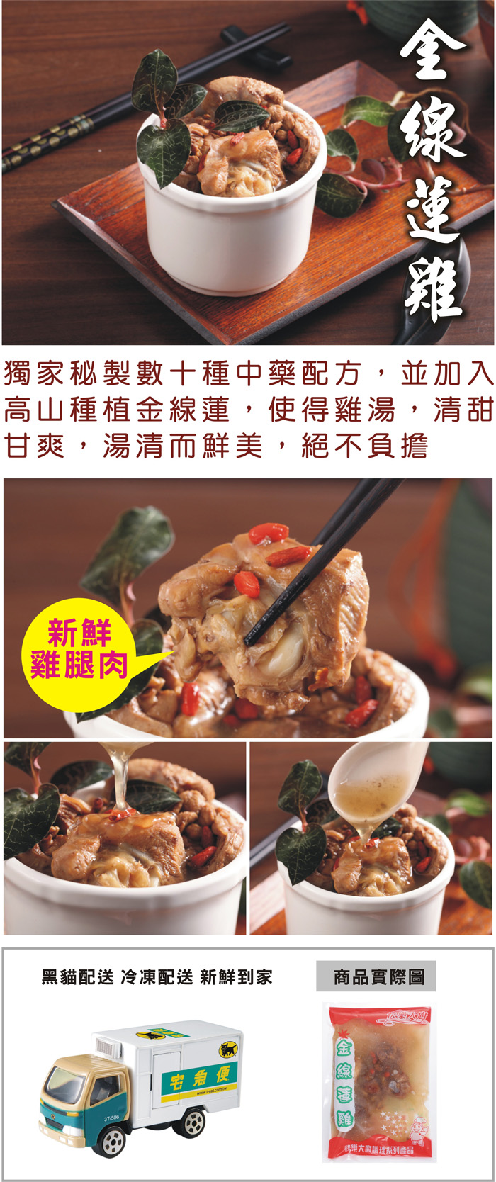 - 成份:高湯(豬骨、水)、上選雞肉、金線蓮、米酒、鹽、味鮮(L-麩酸鈉、胺基乙酸、