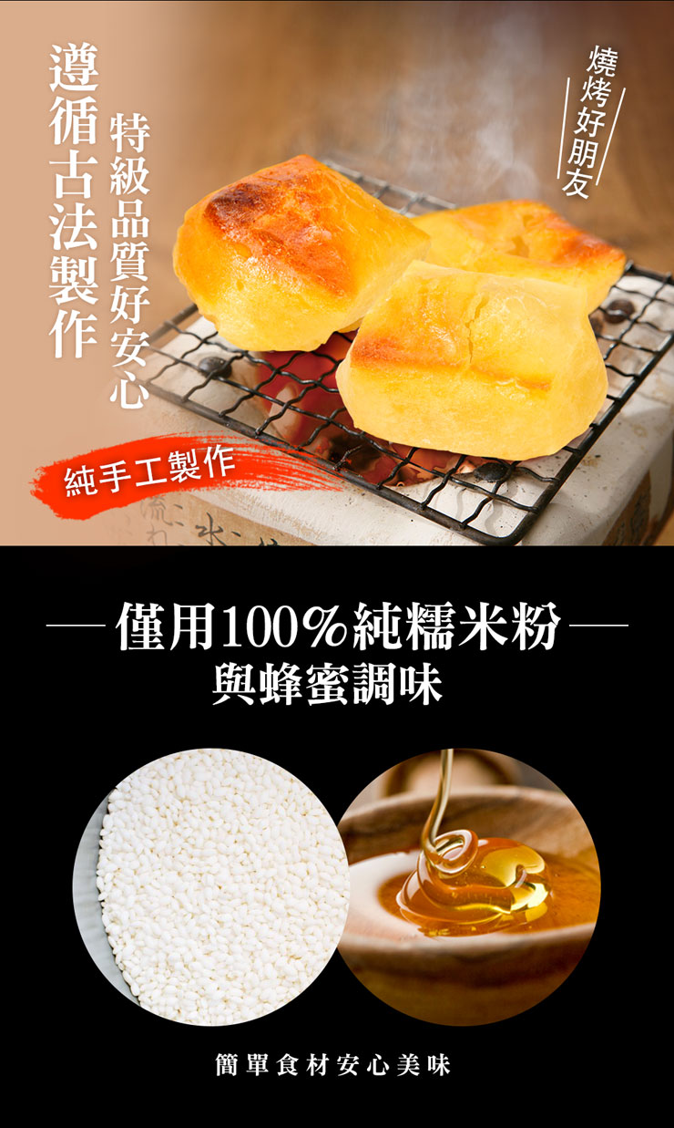 僅使用100%純糯米粉與蜂蜜調味,雙重逆滲透淨水古法手工揉製, 風味獨家