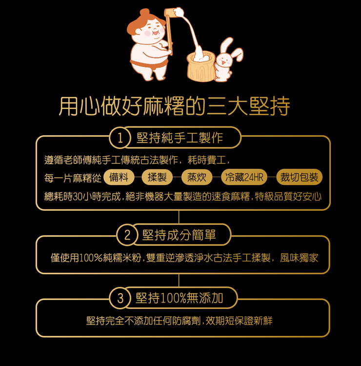 遵循老師傅純手工傳統古法製作, 耗時費工,每一片麻糬從備料–揉製–蒸炊–冷藏24hr–裁切包裝,總耗時30小時完成,絕非機器大量製造的速食麻糬,特級品質好安心