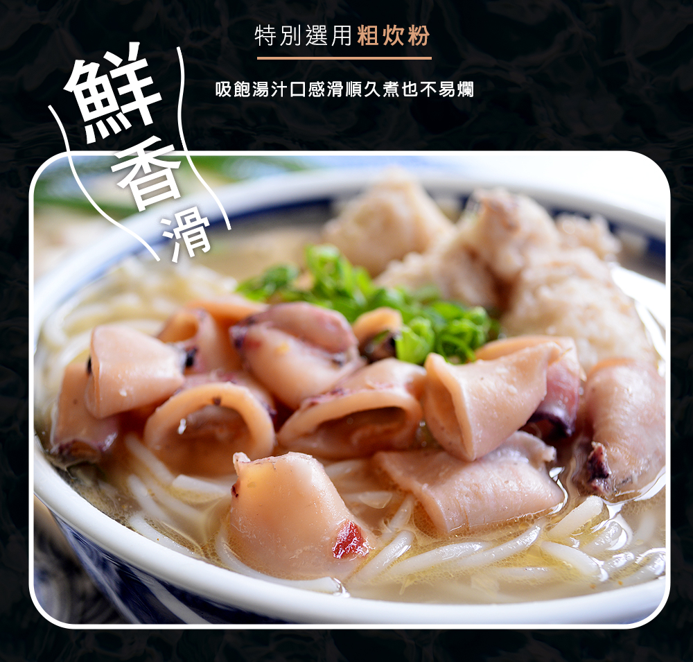 - 內容物名稱:水、炊粉、小卷、芋頭、紅蔥油(大豆油、紅蔥頭)、豚骨高湯醬【乳化豬汁〔豬骨、水、豬油、食鹽、維生素E(抗氧化劑)〕】、水、醬油、蒜油〔大豆沙拉油、豬油、蒜頭、食鹽、維生素E(抗氧化劑)〕、大豆沙拉油、豬頭骨濃縮汁〔水、豬頭骨、豬皮、維生素E(抗氧化劑)〕、食鹽、大豆水解蛋白〔昆布抽出液、水解蛋白(玉米、小麥、大豆、柴魚)、L-麩酸鈉、L-天門冬酸鈉、5'-次黃嘌呤核苷磷酸二鈉、5'-烏飄玲核苷磷酸二鈉、琥珀酸二鈉、糊精、砂糖、三仙膠〕、薑泥、辣豆瓣醬〔紅辣椒、非基改黃豆、水、蠶豆、蔗糖液糖、香油(大豆油、芝麻)、麵粉、調味劑(5'-次黃嘌呤核苷磷酸二鈉、5'-烏嘌呤核苷磷酸二鈉、)、玉米糖膠、八角粉〕、香蒜粉(蒜片、玉米澱粉、麥芽糊精)、調和白胡椒粉(白胡椒、麩皮粉、麥芽糊精、玉米澱粉、綠辣椒、雞心椒、茶枝)、昆布粉(昆布粉、葡萄糖、食鹽)、油性辣椒紅(芥花油、紅椒色素)