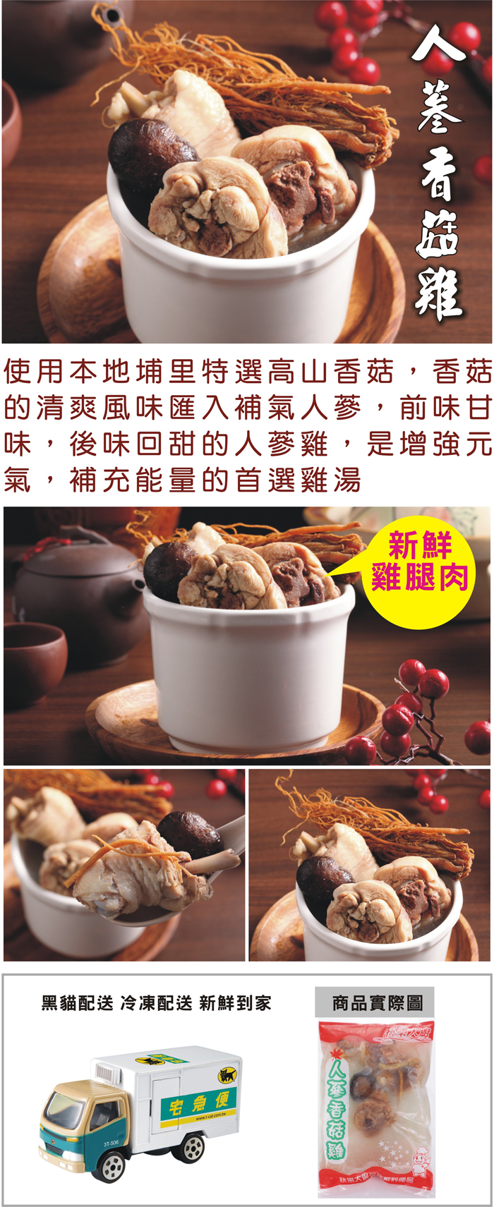 - 成份:高湯(豬骨、水)、上選雞肉、人蔘、香菇、米酒、鹽、味鮮(L-麩酸鈉、胺基乙酸、琥珀酸二鈉、岩鹽、5'-烏嘌呤核苷磷酸二鈉、5'-次黃嘌呤核苷磷酸二鈉)
